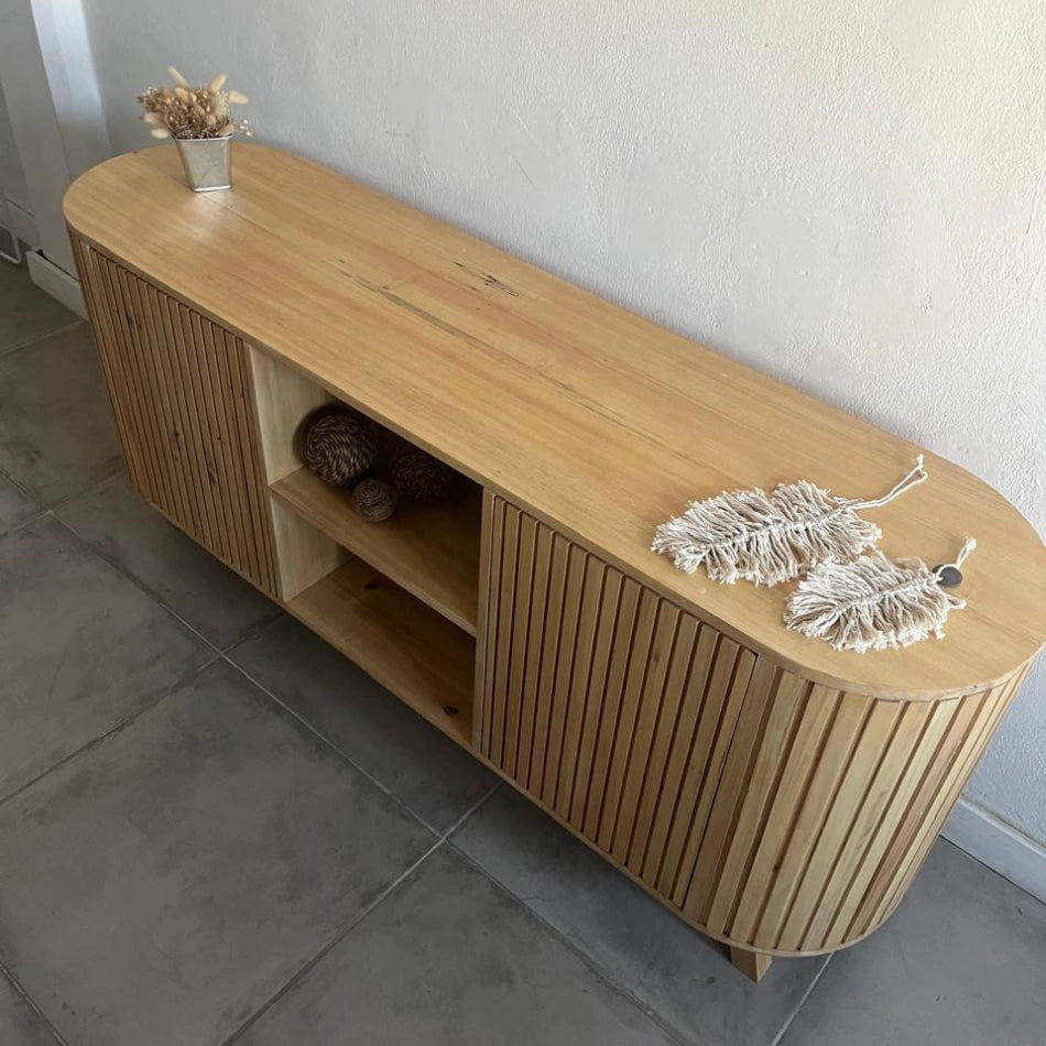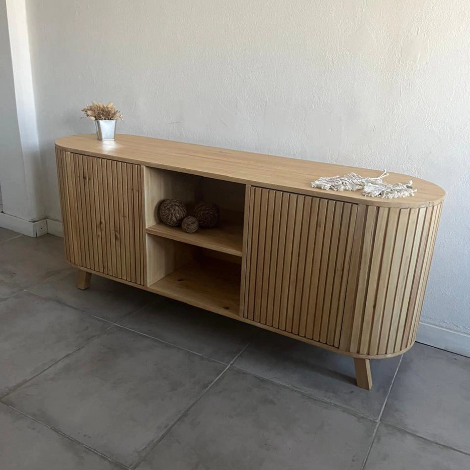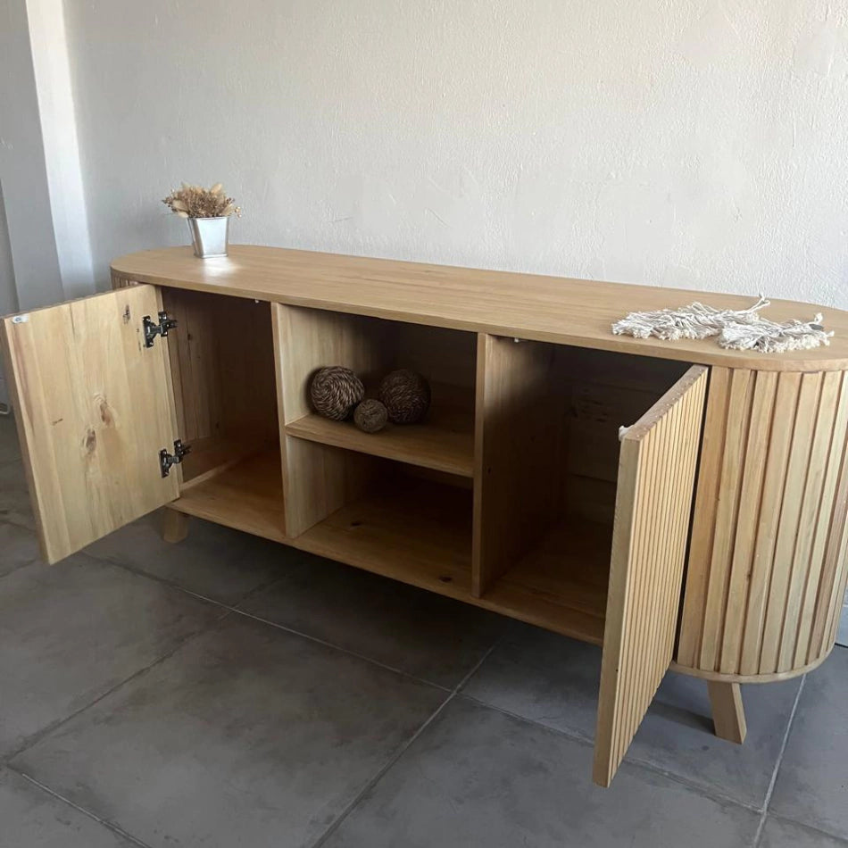 Este sofisticado mueble está fabricado en madera de acabado natural, con un diseño único de puertas curvas con listones verticales, que aportan movimiento y modernidad a cualquier espacio. Su estilo minimalista y elegante lo convierte en una pieza protagonista dentro de la decoración del hogar.