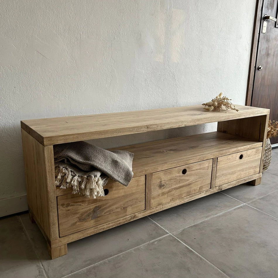 Su estructura robusta y líneas simples lo convierten en una pieza versátil, ideal como rack de TV, mesa de arrimo o mueble auxiliar en salas de estar, dormitorios o pasillos. Además, su tono cálido de madera se adapta fácilmente a distintos estilos de decoración, desde el nórdico hasta el bohemio.
